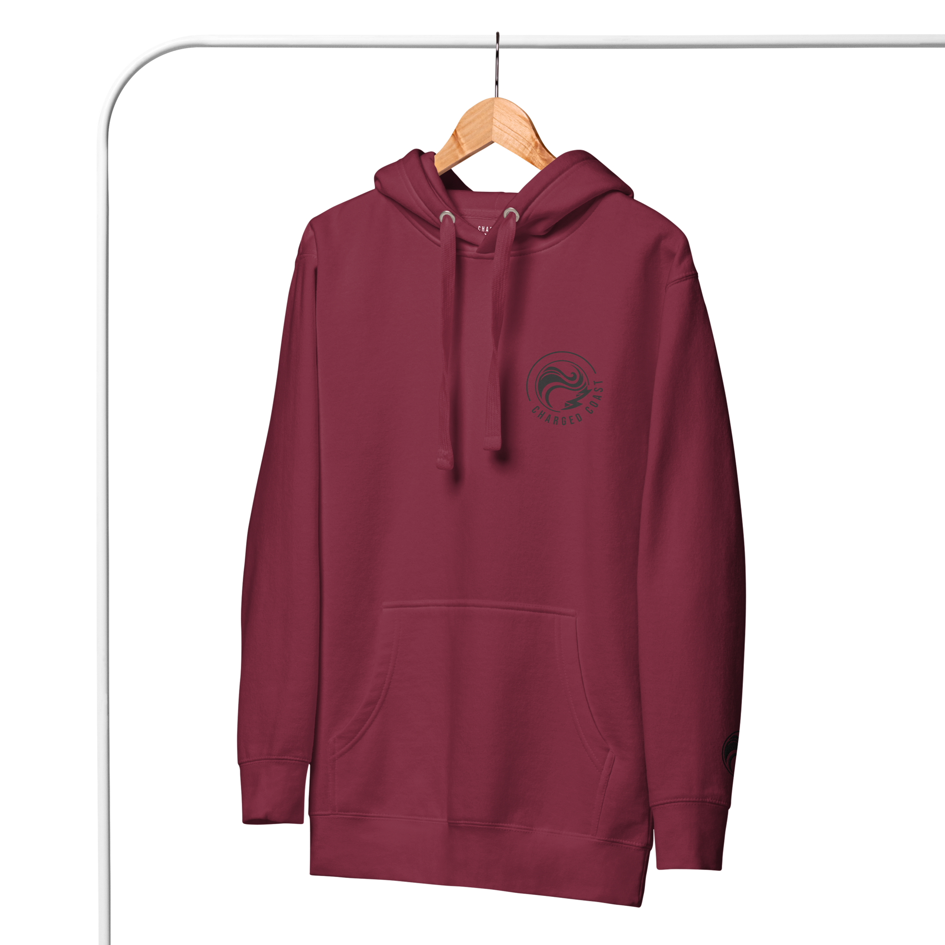 Non-Negotiable warmth for coastal winters. Cotton hoodie with bold Charged Coast back print—tough for the jobsite, clean for the boardwalk.